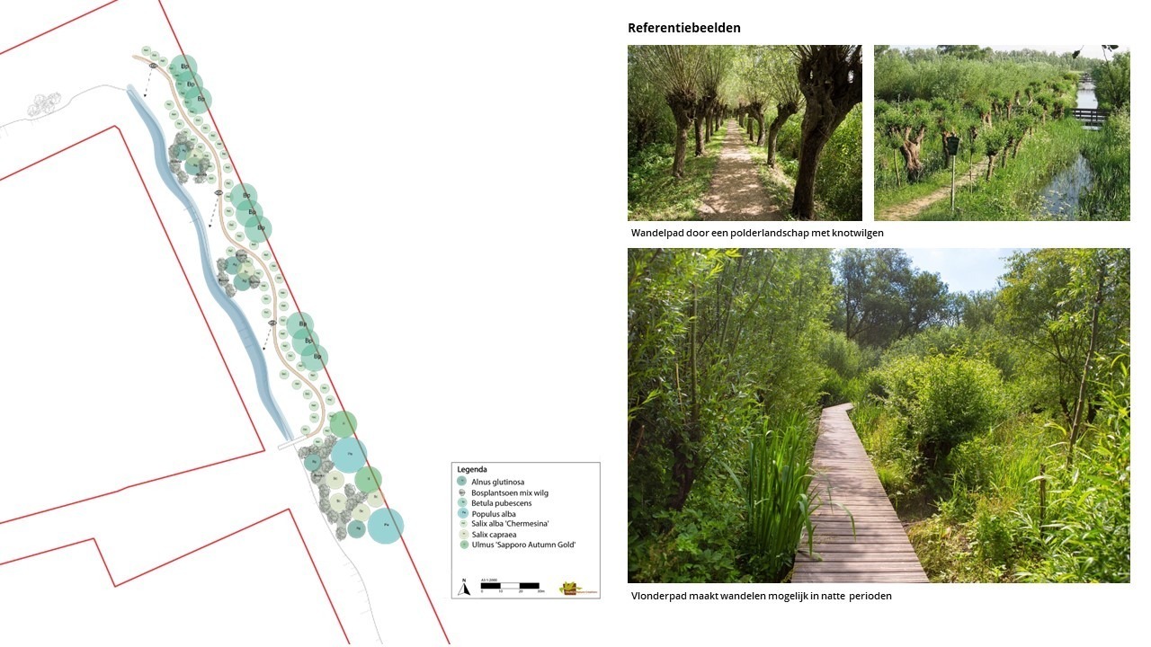Het compensatieplan sluit aan op het landschapsontwikkelingsplan van de gemeente. Dit gebied zal bestaan uit een dubbele knotwilgenlaan met hier en daar doorkijkjes over het water. Dit zorgt voor interessante zichtlijnen waar de lunchwandeling van het personeel van de omliggende bedrijven veel plezier van gaan hebben. Er loopt hier namelijk een wandelpad en langs een ecologische oever staan clusters van enkele boomvormers met bosplantsoen van diverse wilgen. Op deze manier is er volop ruimte voor biodiversiteit en diversiteit aan beplanting.