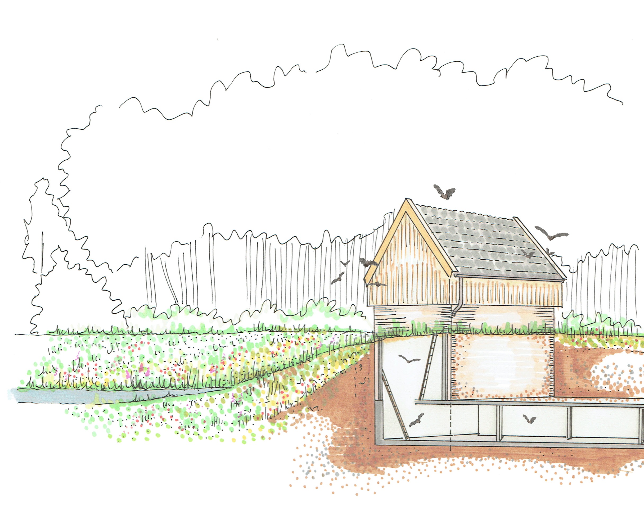 Een oude mestkelder kreeg in Eibergen een tweede leven. Het werd een vleermuiskelder die verdeeld is in kamers om extra microklimaten te creëren. De kelder is afgedekt met een laag grond om een stabiel binnenklimaat te verkrijgen. Op de mestkelder bouwden we een zomerhuisje met spouwmuur en gevelbetimmering. Daarnaast legden we een poel aan om het aanbod in voedsel te vergroten. Bovendien is het terrein ingeplant met avondbloeiende planten die extra voedseldieren aan trekt.